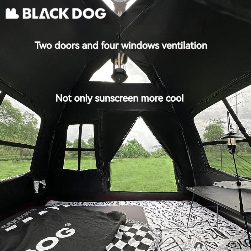 BLACKDOG Automatic Tent – Black coating, two doors, four windows. 6㎡ space for 3-4 adventurers. 150D Oxford fabric with PU3000 waterproofing and UPF50+ UV protection. Quick automatic opening, glass fiber bracket, B3 mesh for breathability. Durable three-season design, lightweight at 6.2kg. Ideal for rugged outdoor excursions.